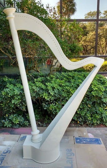 The largest build for The Price was the family heirloom harp. With no harp in stock and rentals well out of price range, a drawing was created based on estimated proportions and a replica was built. Materials used include plywood, flexible plywood, flexible trim, fishing line, and plastic column details for the base and capital.